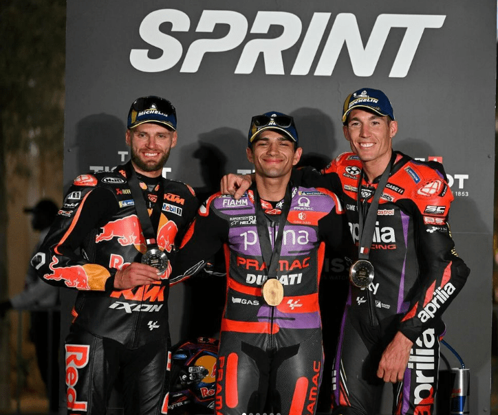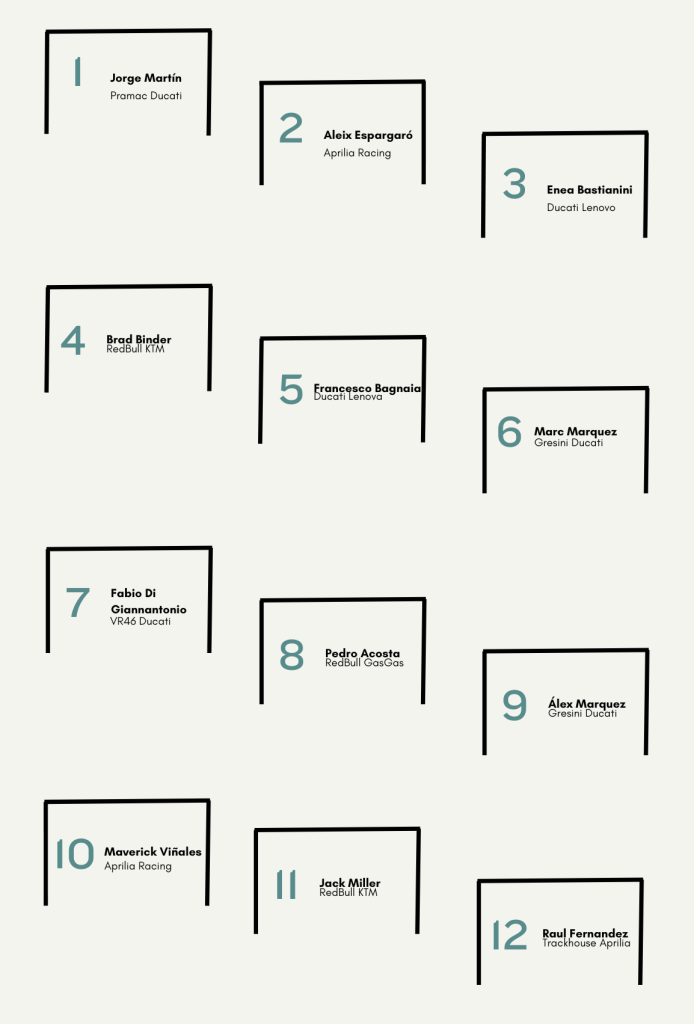 The lights went out and the two KTMs had a strong start off the line, Marc Marquez lost a few positions, along with Pedro Acosta who dropped 3 places to 11th in his first ever Sprint. Pecco started attacking his teammate to start his podium campaign.