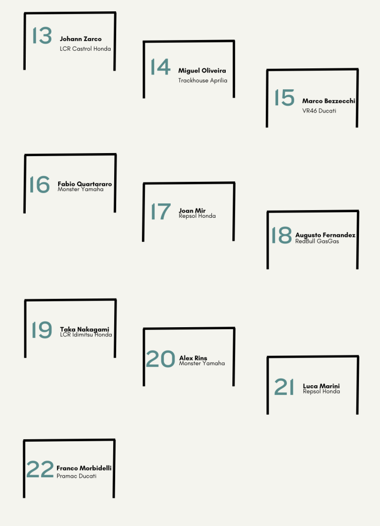 The second half of the pack going through in Q1 consists of, Raul Fernandez with a 1.51.519, Oliveira, Bezzecchi, Quartararo, Miller, Zarco, Mir, Augusto Fernandez, Rins, Nakagami, Morbidelli, and Marini.